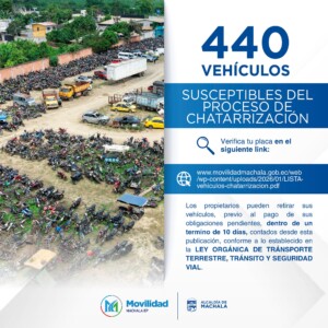 440 vehículos se encuentran susceptibles al proceso de chatarrización, conforme a lo establecido en la Ley Orgánica de Transporte Terrestre, Tránsito y Seguridad Vial.